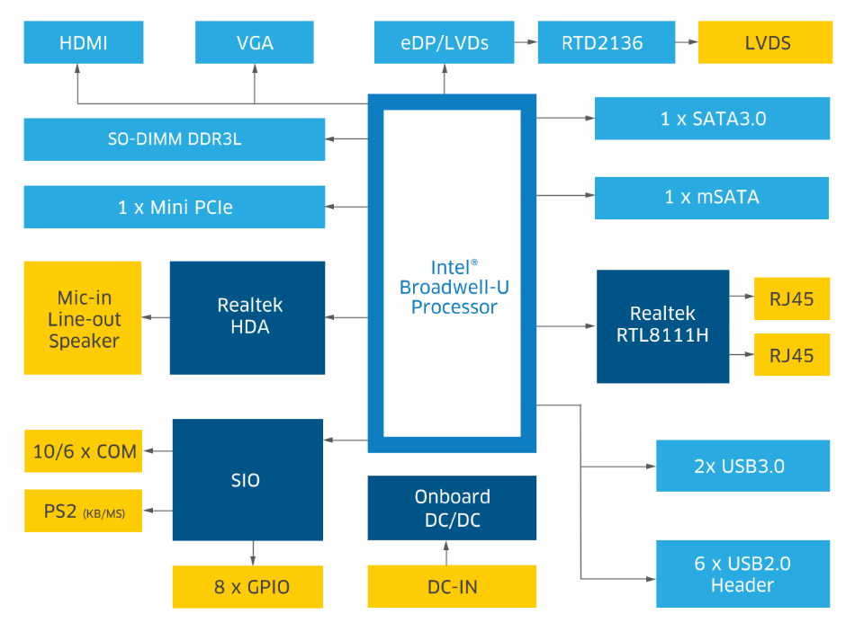 Display: Multiple display via HDMI, VGA, LVDS/eDP